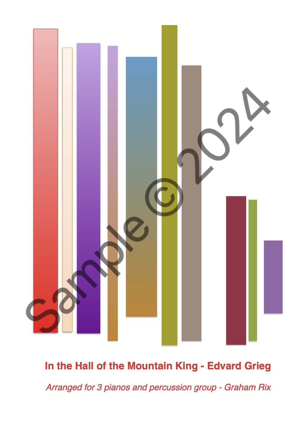 This is an arrangement of the Grieg classic from his Peer Gynt Suite, In the Hall of the Mountain King. There are parts for 3 pianos and a percussion group doing simple sound effects and tapping, clapping, drumming. A spooky atmosphere is created at the beginning with piano clusters and eerie whispers and rustling from the percussion group. Then everyone plays the main them repeatedly getting higher and higher and faster and faster. Really exciting to play and a great fun project for a piano ensemble or piano group. Easy to Intermediate difficulty - leaning towards intermediate.