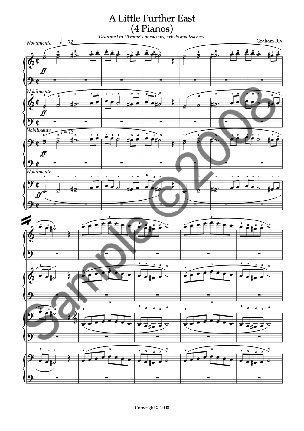 An original composition for four pianos or keyboards (1' 58"). Suitable for beginners to intermediate players. Great for a piano group or piano ensemble or for multi-pianos or keyboards.